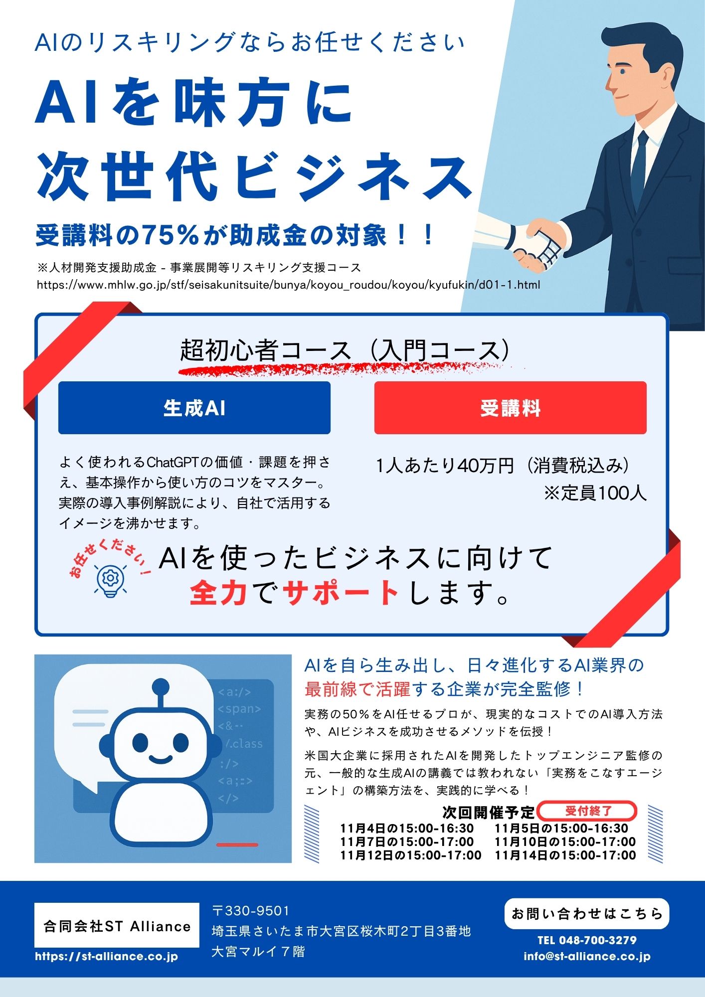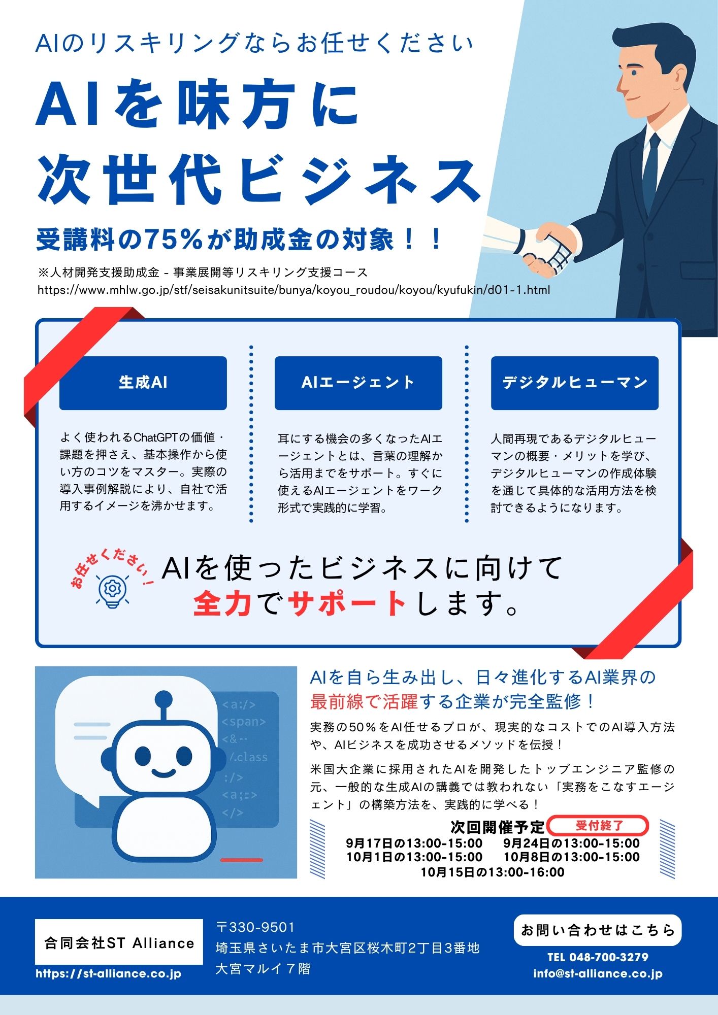 日常業務の効率化から専門的なタスクまで、AIを使った業務改善手法を習得。Excel関数の自動生成、プログラミング支援、創造的なコンテンツ制作など、人材不足を補う実践的なAI活用スキルを身につけます。